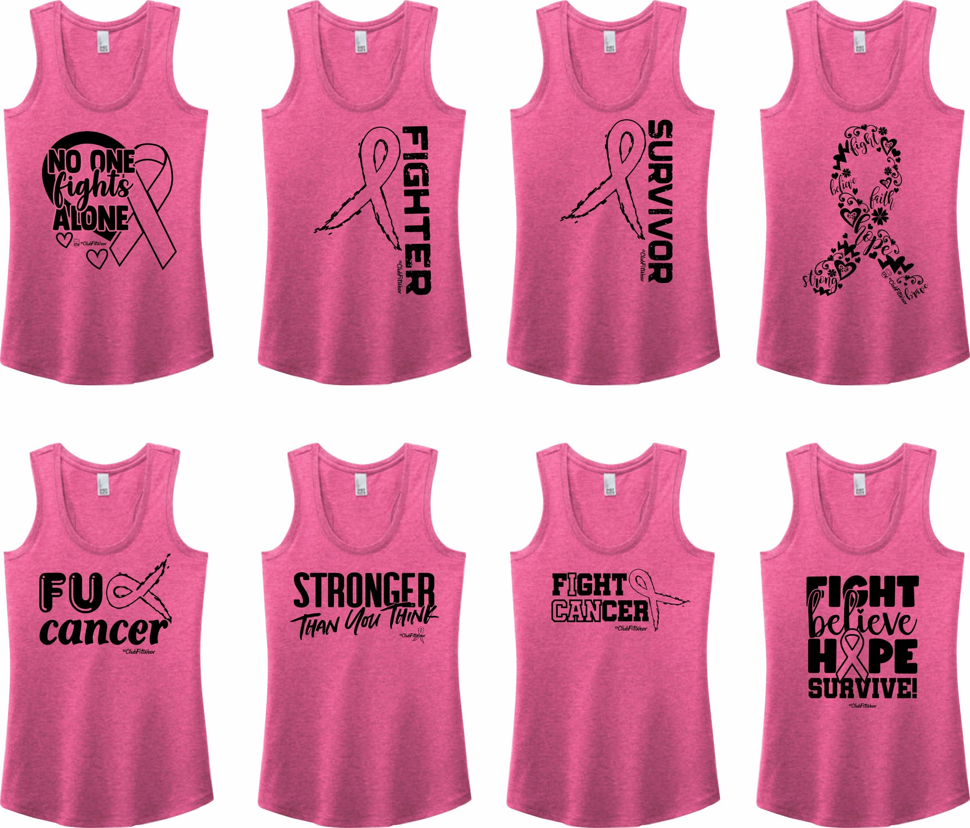 8 Breast Cancer Awareness Prints on Pink Premium Racerback Tanks w/sizing up to 4xl